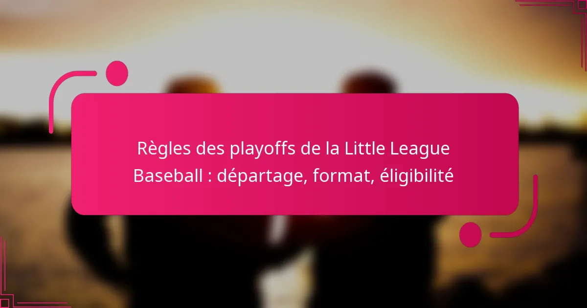 Les playoffs de baseball de la Little League sont régis par des règles spécifiques qui traitent de l’éligibilité, du format des playoffs et des procédures de départage afin de maintenir une compétition équitable. Les départages sont cruciaux pour déterminer le classement des équipes lors des playoffs entre celles ayant des bilans identiques, en utilisant des critères tels que les résultats directs et la différence de points. Le format des playoffs peut varier, comportant généralement soit des structures à élimination directe, soit des structures à double élimination en fonction des règlements de la ligue, les équipes se qualifiant en fonction de leur performance durant la saison régulière.